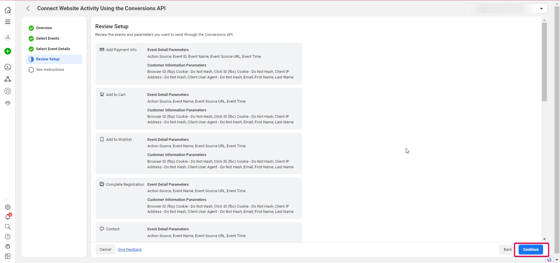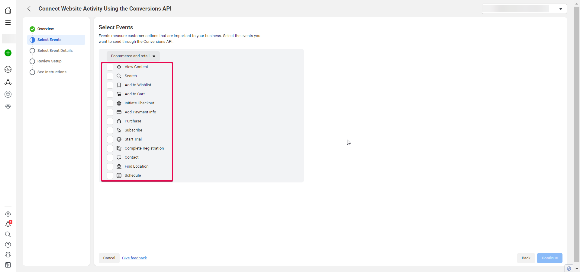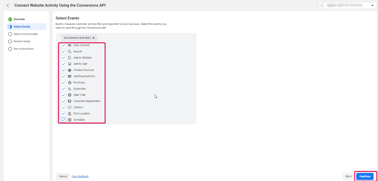 Then it would be best to choose the events you want to send to Facebook. Select all the events you wish to send to Facebook, and click on Continue.