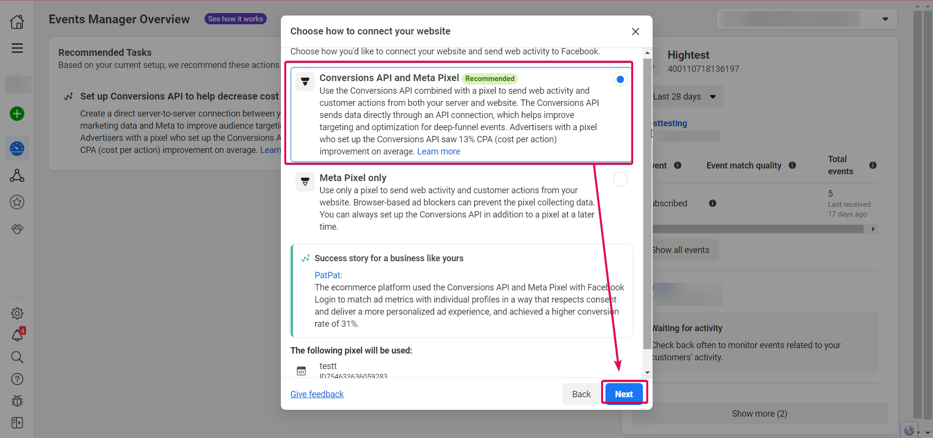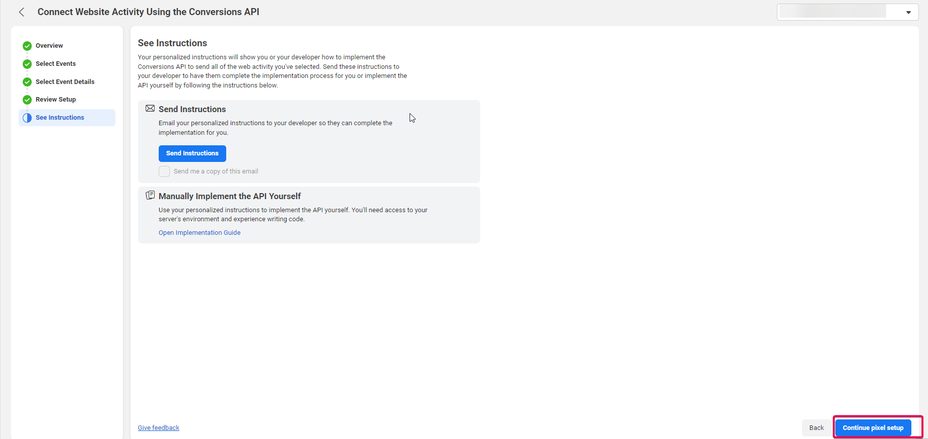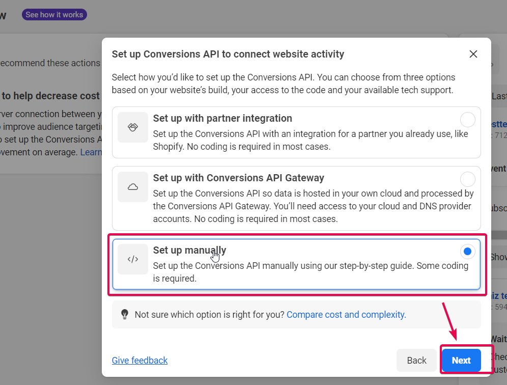 8. It will then ask how you want to Set up Conversions API to connect website activity. Choose Set up Manually.