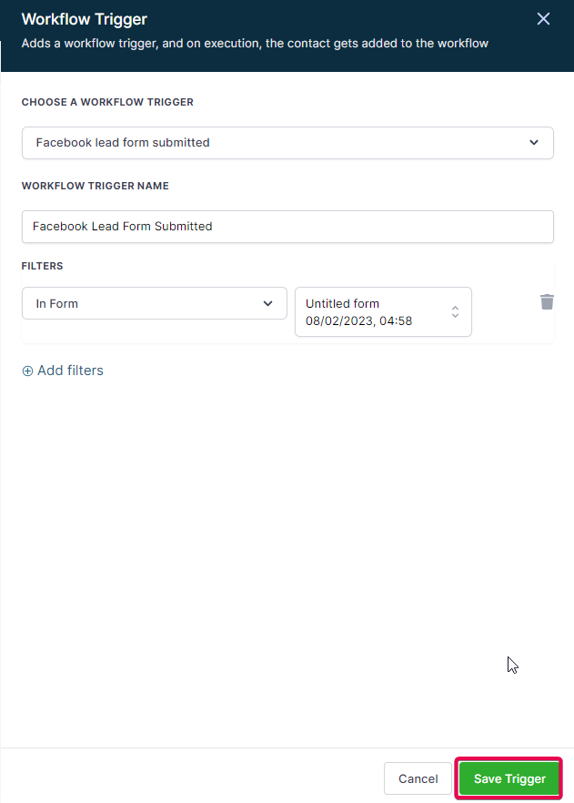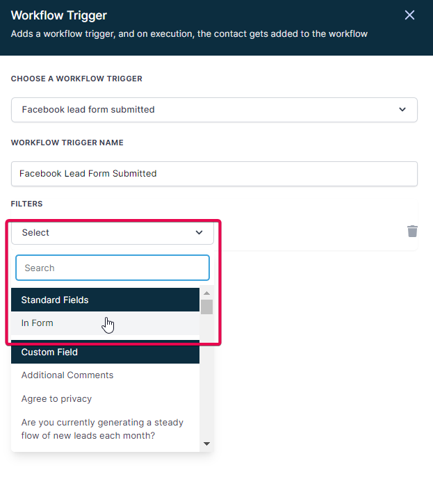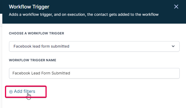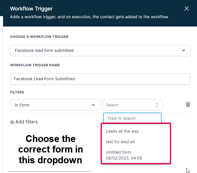 If you want it to get fired off by Facebook Form submissions for a specific form, Add Filters>In Form> Choose the Facebook Lead Form. You will not need to add any filters to this trigger unless you want it to get fired off by only specific submissions.