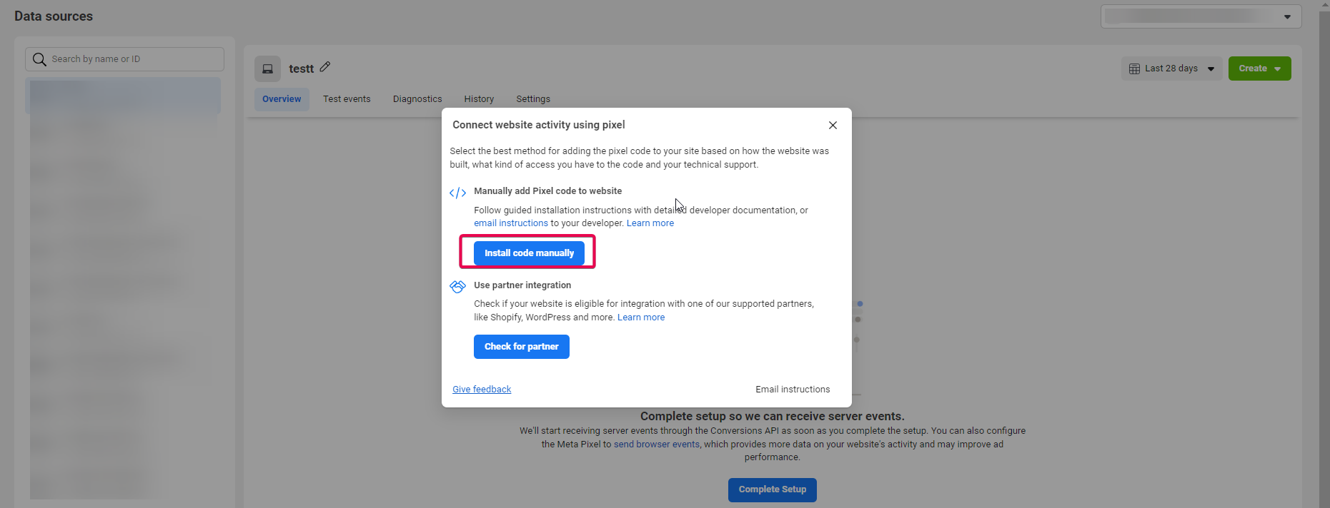 15. You will be shown a popup to Connect website activity using Pixel; choose Install Code Manually.