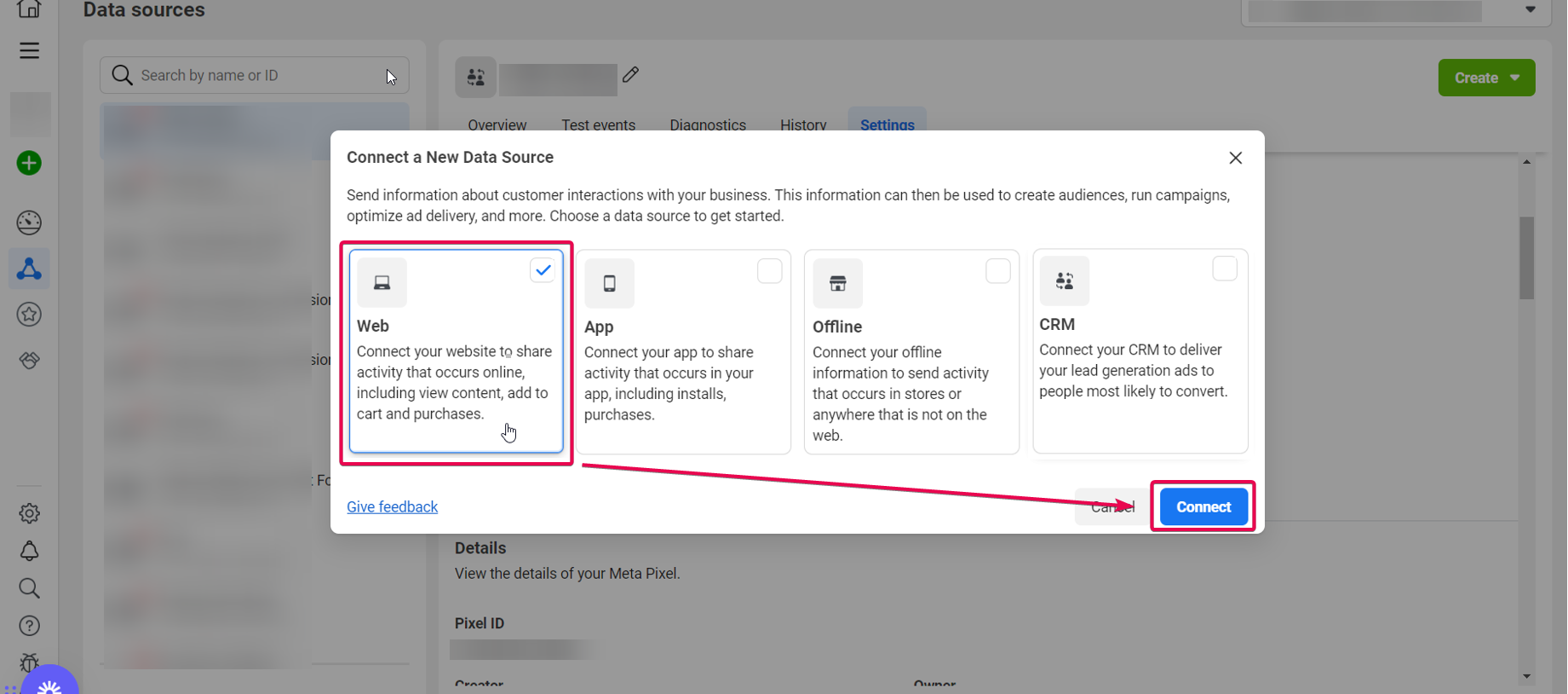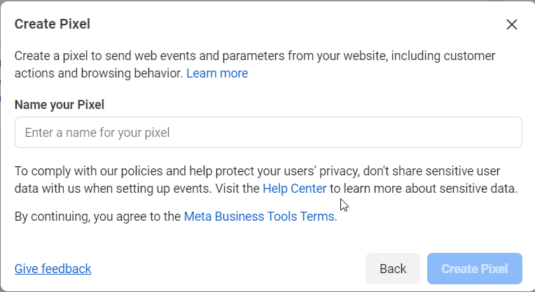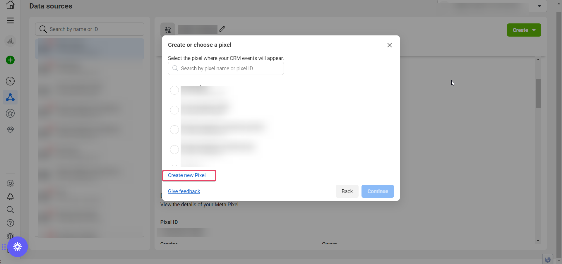 If you already have pixels, it will ask you to choose between them or create a new pixel. Click on Create New Pixel or Use an existing pixel from the list for collecting the data. Click Continue when the pixel details are added.