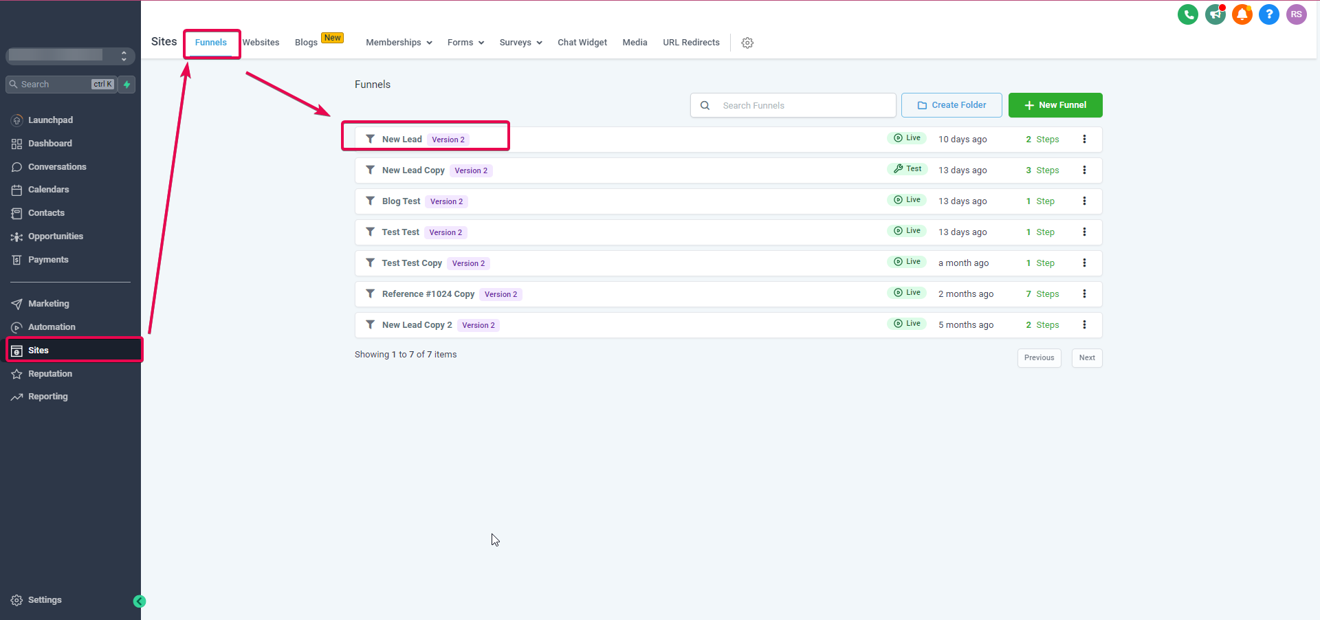 18. Head on to Sites in the left sidebar and then to Funnels or Websites (depending on where you built the site, which is associated with the domain you used in your Pixel Setup)