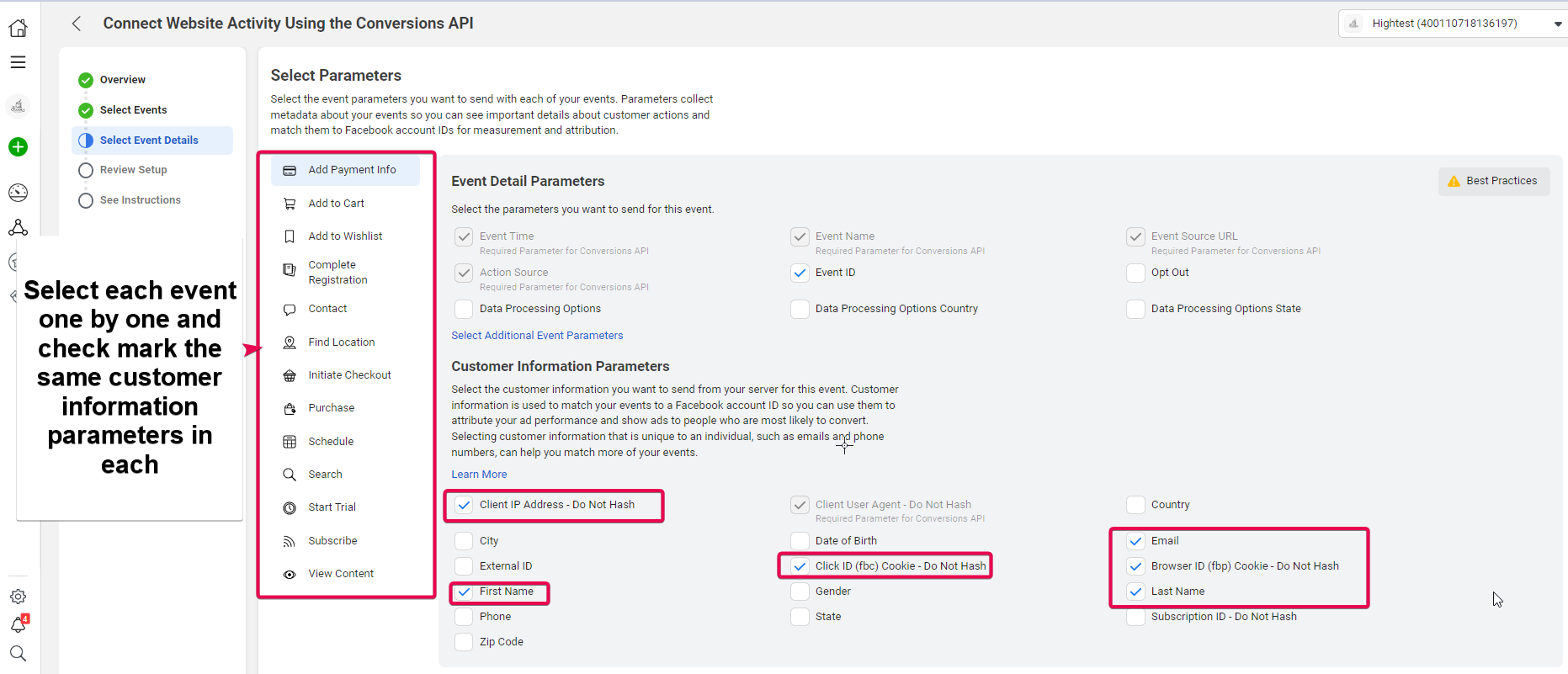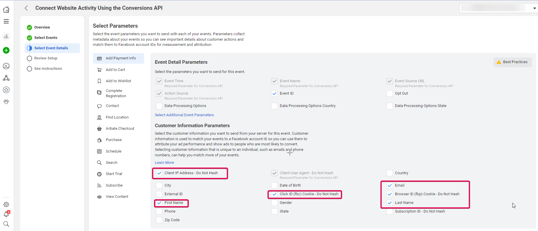 12. Then, under Customer Information Parameters, you will see that Client User Agent will already be marked for you. You must check the Client's IP Address, First Name, Client ID, Email, Business ID, and Last Name.