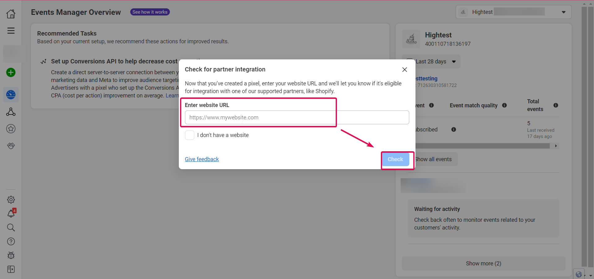 Please add in the domain of the funnel/website where you will later add in the pixel code and then click on Check.