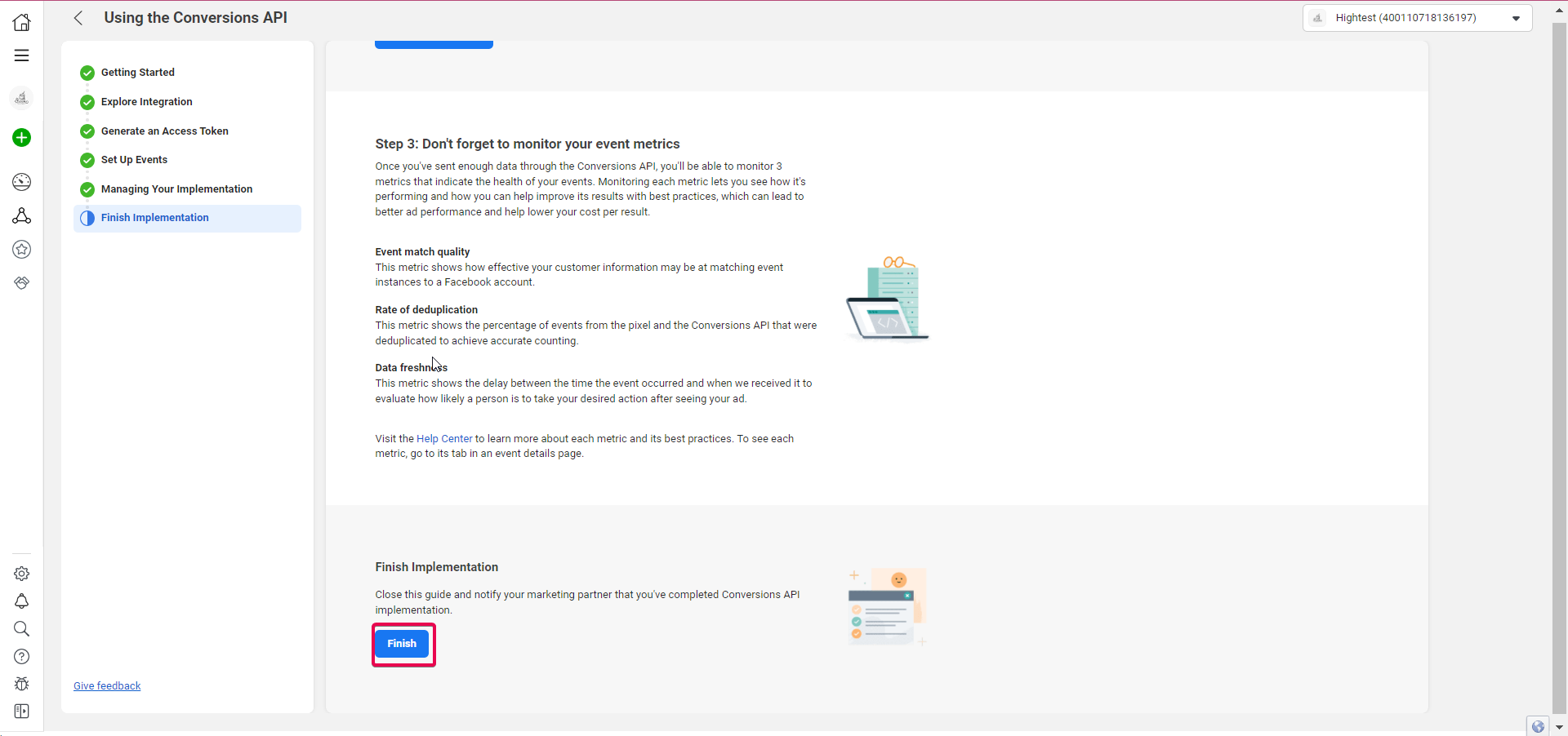 34. Navigate back to your Events Manager, Scroll down to the bottom, and click on, Finish under Finish Implementation.