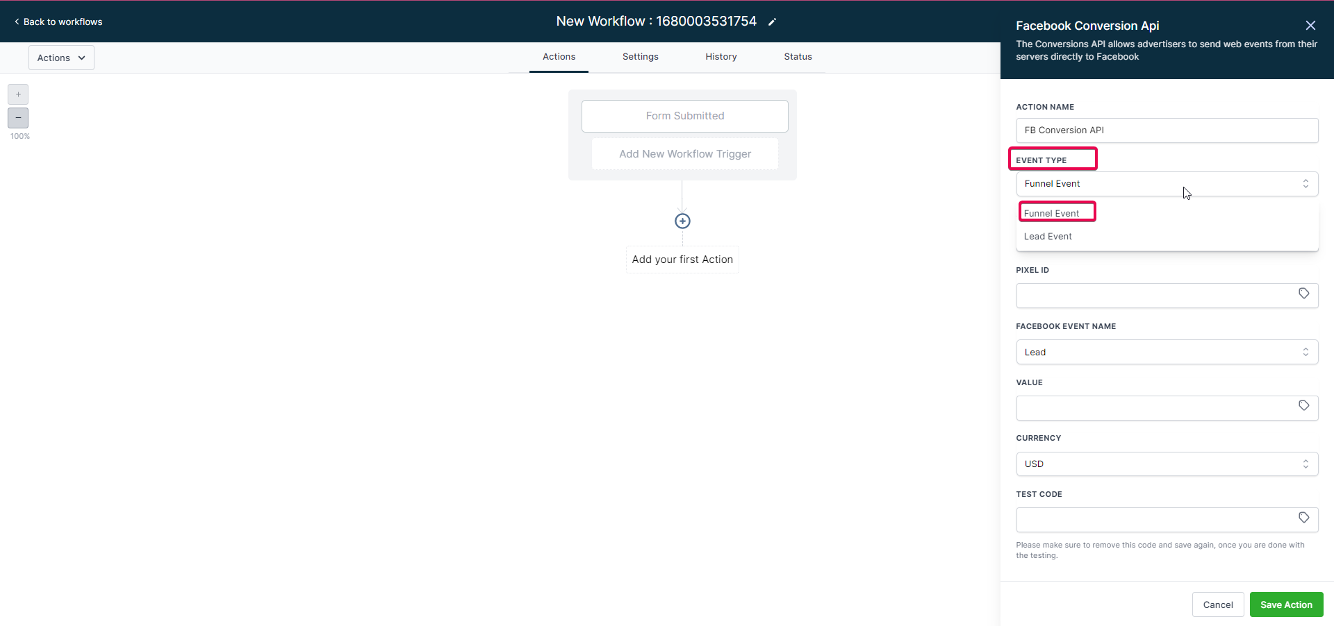 28. Configure the Facebook Conversion API action. You can name this Action in Action Name if you'd like. In the Event Type dropdown, choose Funnel Event.
