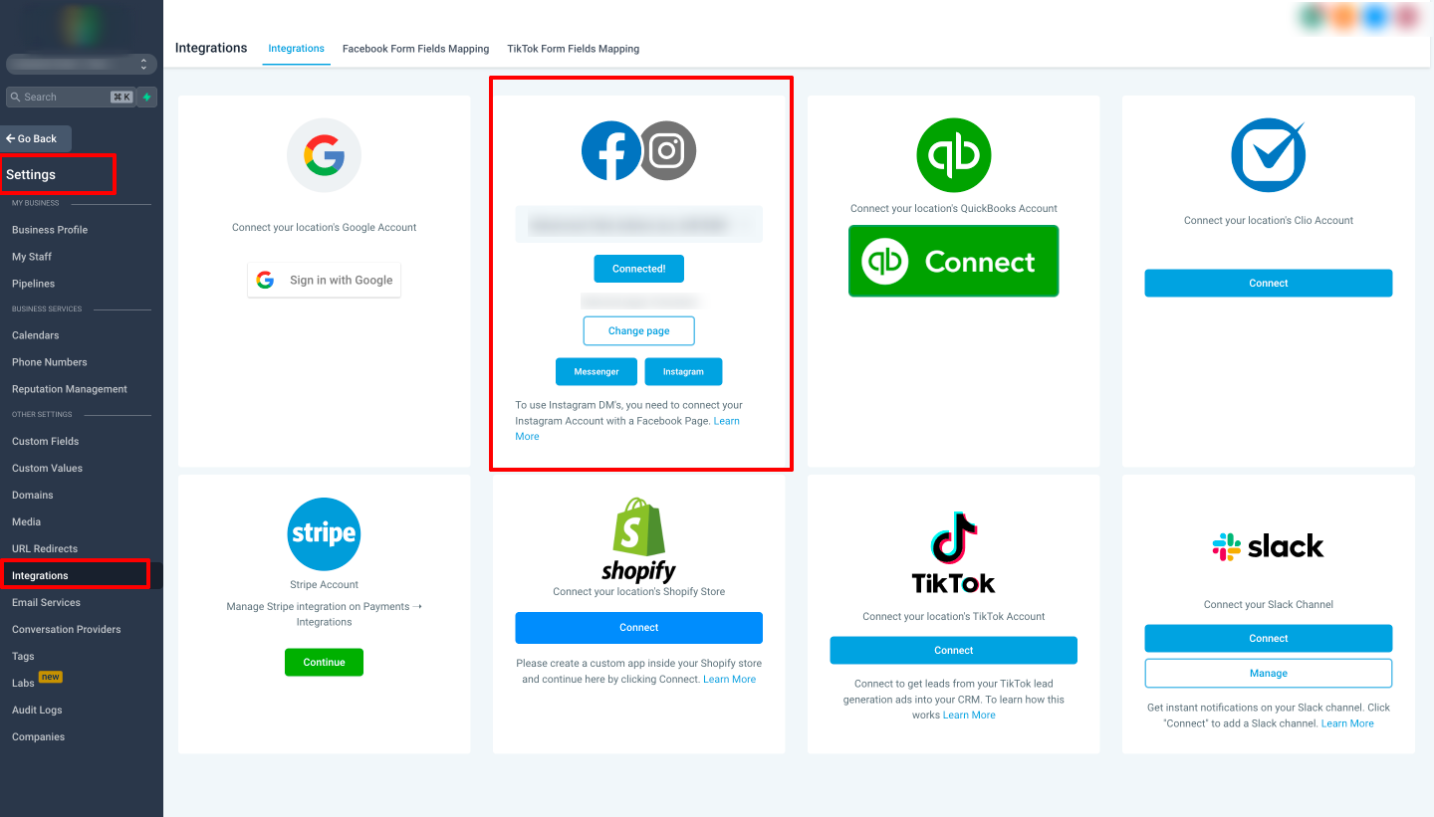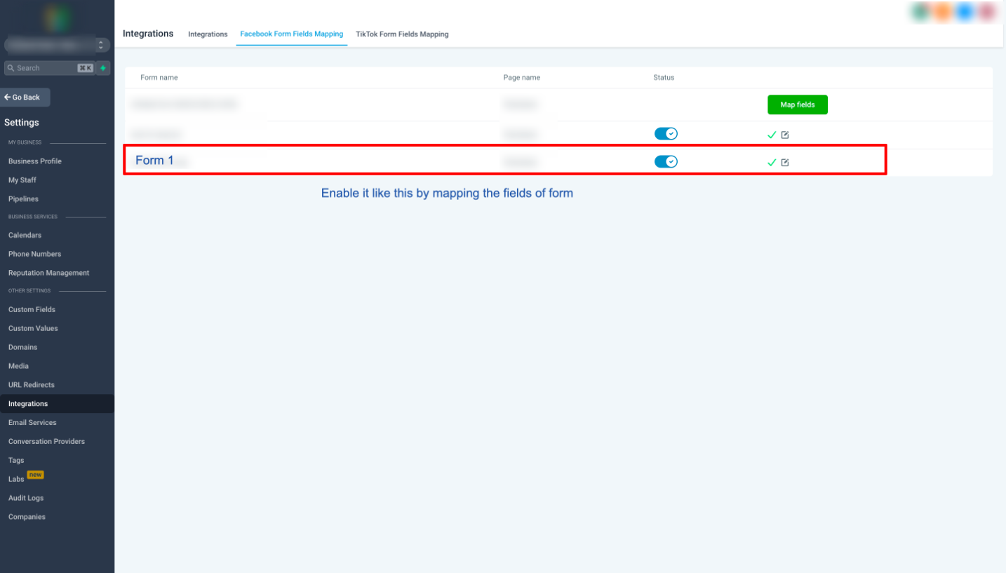 2. In Facebook From Field Mapping, the form should be mapped correctly and the status should be enabled. Facebook form mapping has moved under location settings > integrations > Facebook Form Field Mapping. Here is a list of the supported custom fields which include multiple and single option custom fields as well.