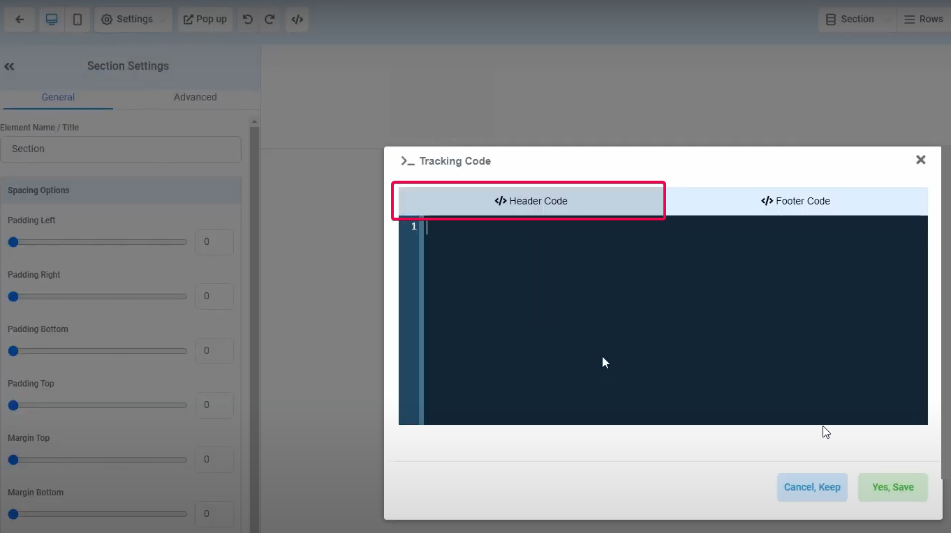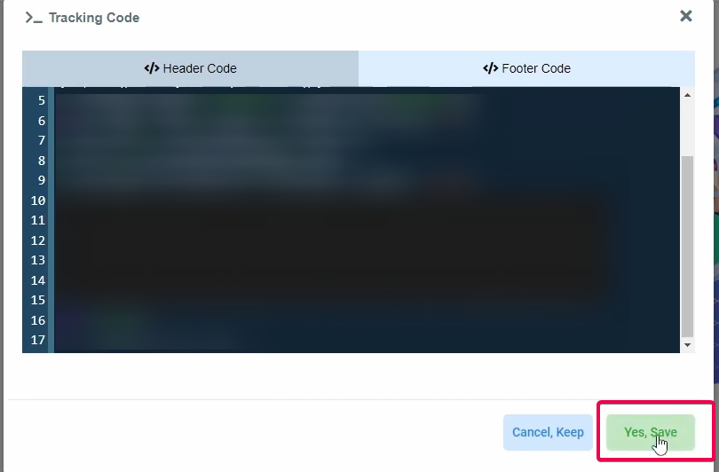 21. Paste the code from step 16 in the Header Code, then click "Yes, Save."
