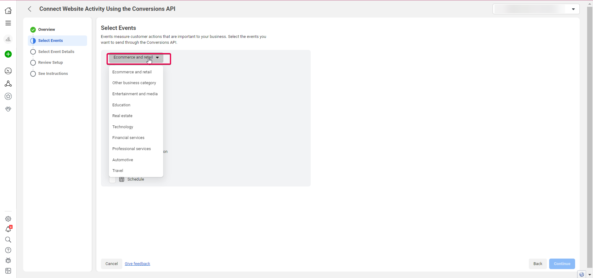 10. You will then be taken to the Select Events tab. You will see a dropdown to choose which Industry you are setting up this Pixel for. Choose the one most relevant to your client.