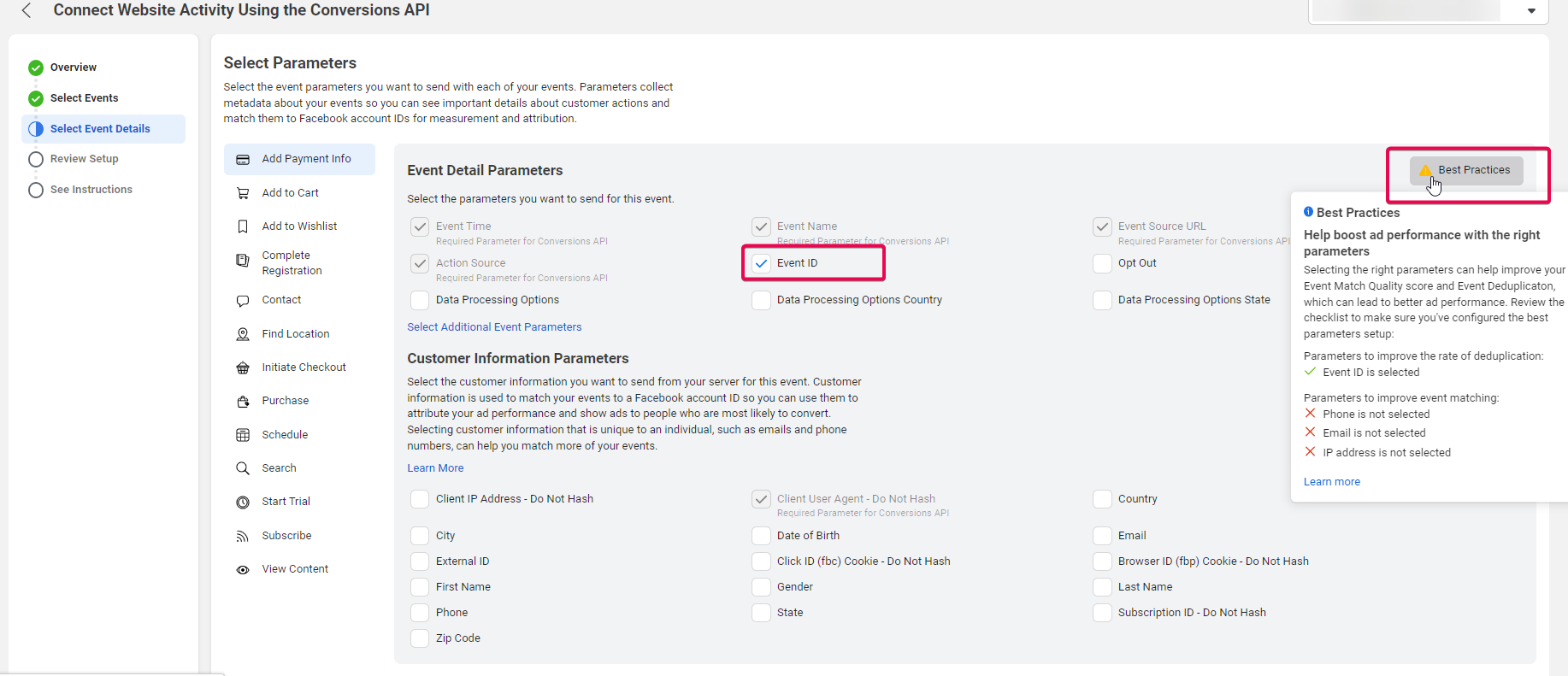 11. You will be taken to the Select Parameters tab, where a few Event Detail Parameters will already be checked. Checkmark Event ID, as the Best Practices tooltip recommends it to the right.