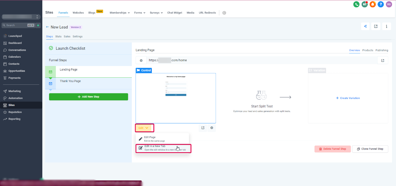 19. Click on Edit Page under your desired page and then preferably Edit in a new tab to go to a different account to access the Funnel Builder.