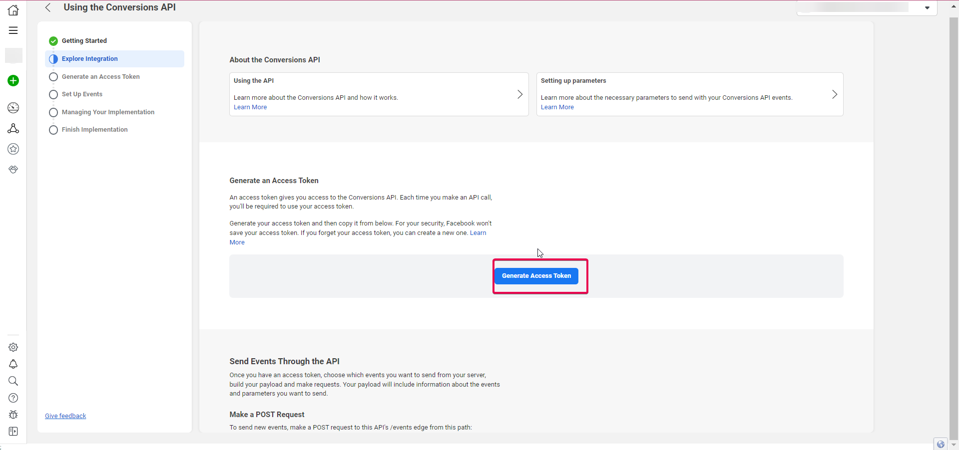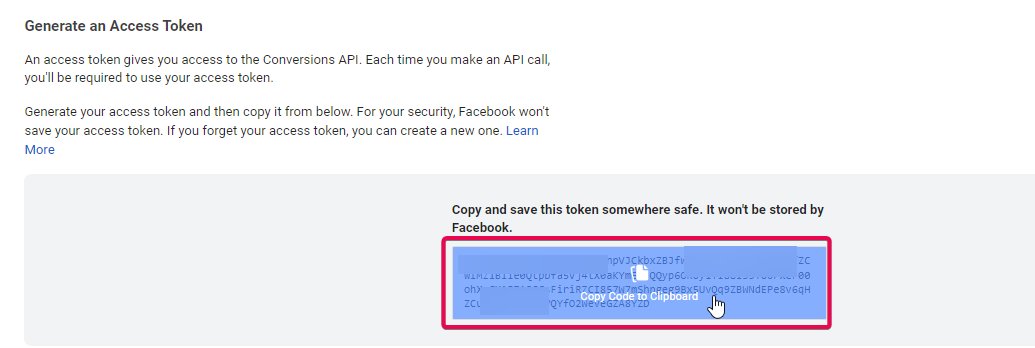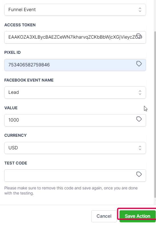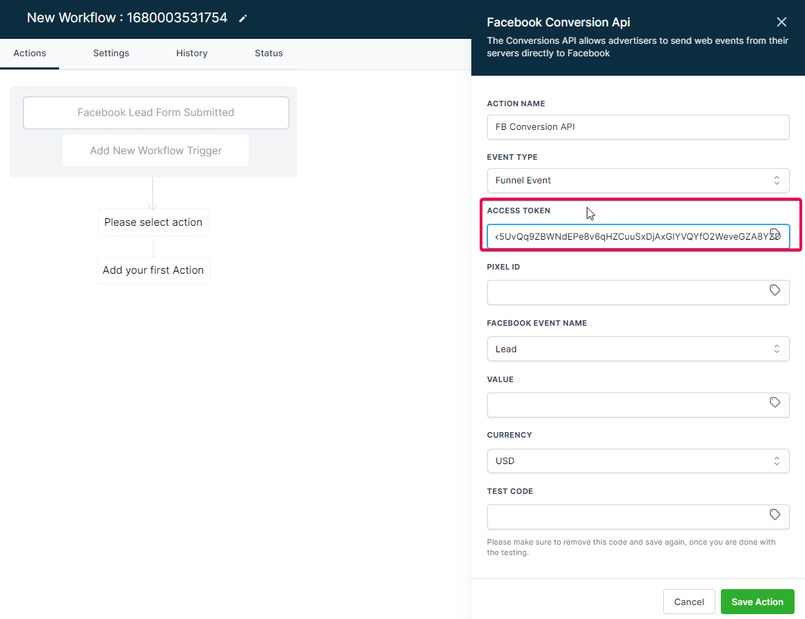 33. Paste the Access token in the Access Token field in the Facebook Conversion API Action.