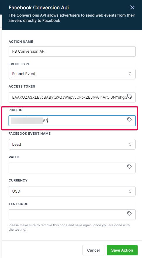 36. Paste the Pixel ID in the Pixel ID field in the Facebook Conversion API Action.