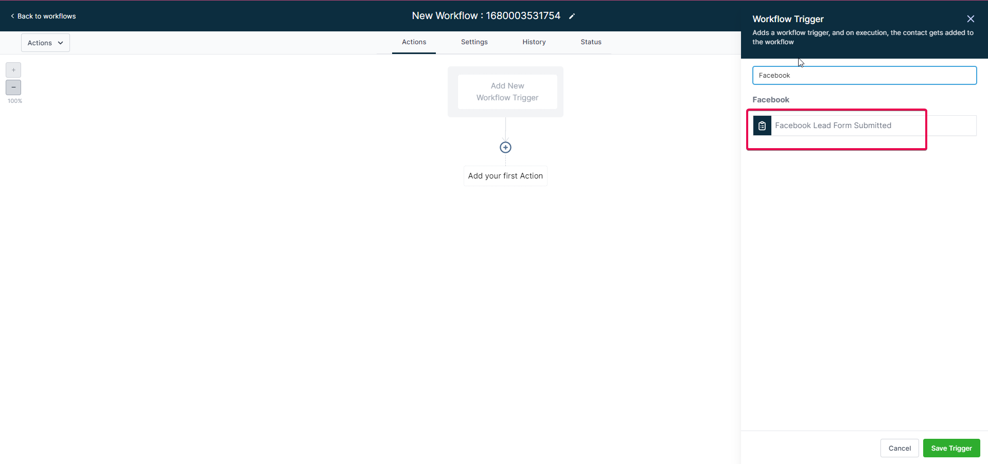 You will need to use the Facebook Lead Form Submitted trigger step to trigger this workflow.
